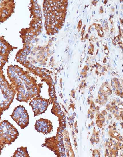 甲状腺乳头状癌,THY染色,细胞质阳性。