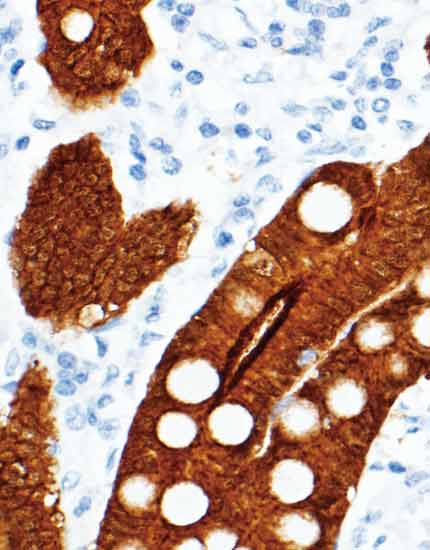 结肠管状腺癌,Villin染色,细胞质阳性。