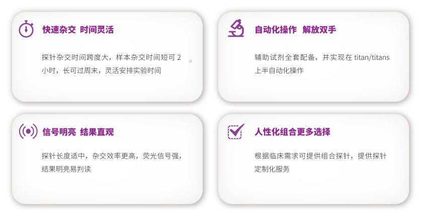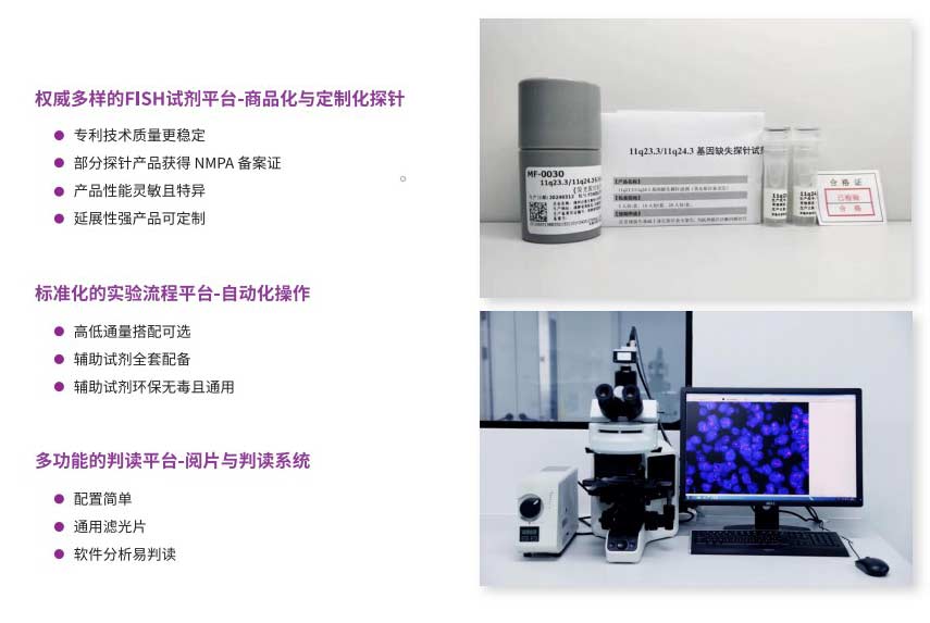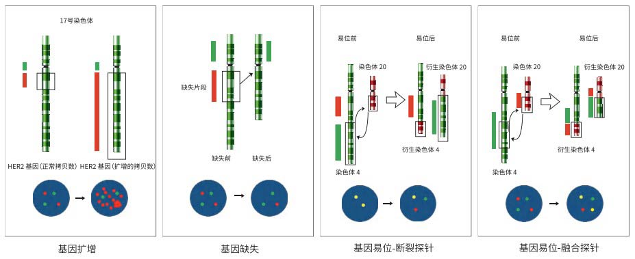 FISH 主要用于病理的辅助诊断及鉴别诊断,疾病预后评估和指导临床靶向治疗等,是近十几年来在临床病理检测中运用最为广泛的一种分子细胞遗传学诊断技术。可检测基因的扩增、缺失、断裂、融合。